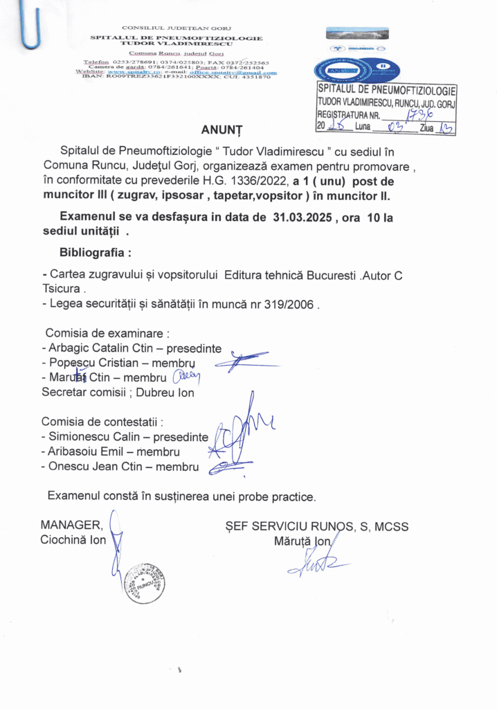 Spitalul de Pneumoftiziologie „Tudor Vladimirescu”, cu sediul în Comuna Runcu, judeţul Gorj, organizează examen pentru promovare, în conformitate cu prevederile H.G. 1336/2022, a 1 (unu) post de muncitor III (zugrav, ipsosar, tapetar, vopsitor) în muncitor II.