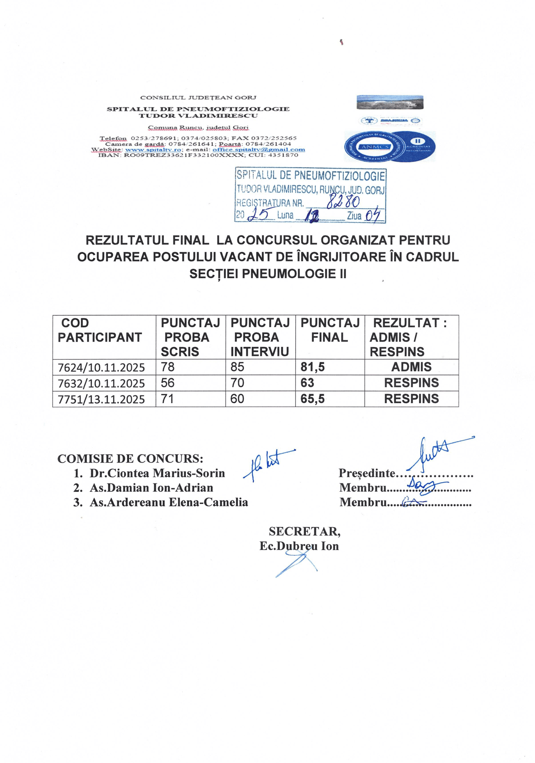 Rezultat final concurs Ingrijitoare sectia Pneumologie II